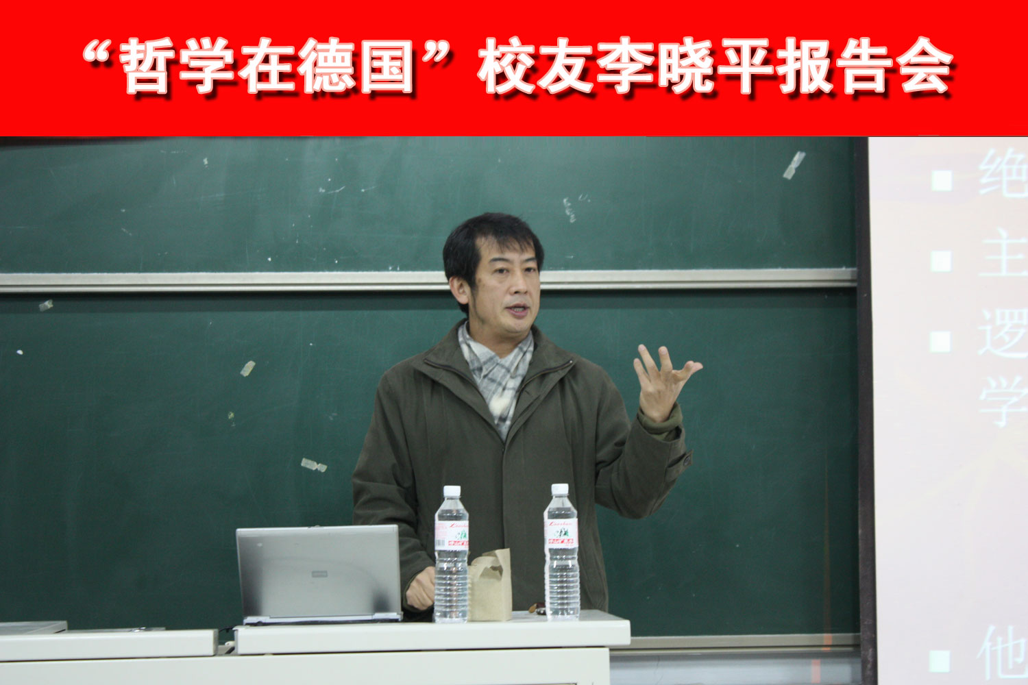 校友李哓平以在德国求学亲身经历的直接经验,将德国高等学校关于哲学人文社会科学的教与学作了理性概括。概述了德国大学哲学人文学科的课程设置,系统阐述了哲学是“科学之王”的重要价值,重点介绍了对德国哲学发展有重要影响的黑格尔、费尔巴哈、马克思、尼采和叔本华五位哲学家的主要观点,辩正分析了中、德哲学文化差异的根源。谈及德国的大学生活,李哓平以“大学兄”的身份指出,步入高等学府,即是半个社会的人。德国的大学生可学之点,即少了许多对父母的依赖,不是被动、而是自觉地博览群书获取知识,通过打工锻炼自己的生存能力。他希望同学们在大学生活中要把握机遇,珍惜大学的黄金时间,努力去创造辉煌的学业、事业和人生!